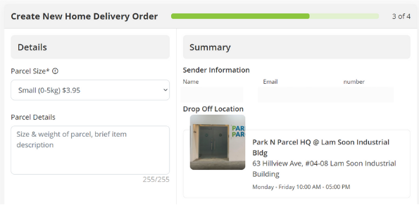 Select Park N Parcel HQ @ 1 Buroh Cres to create home pick-up later.