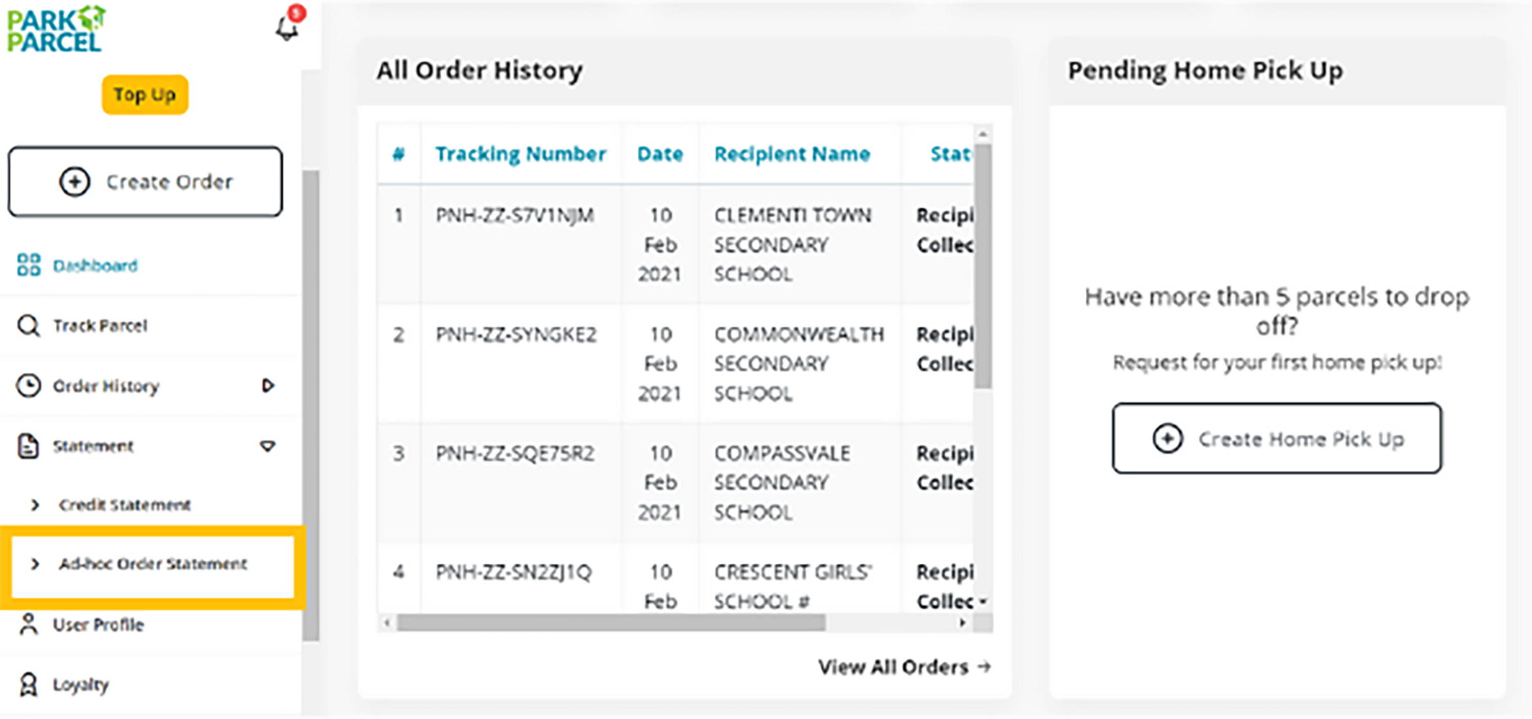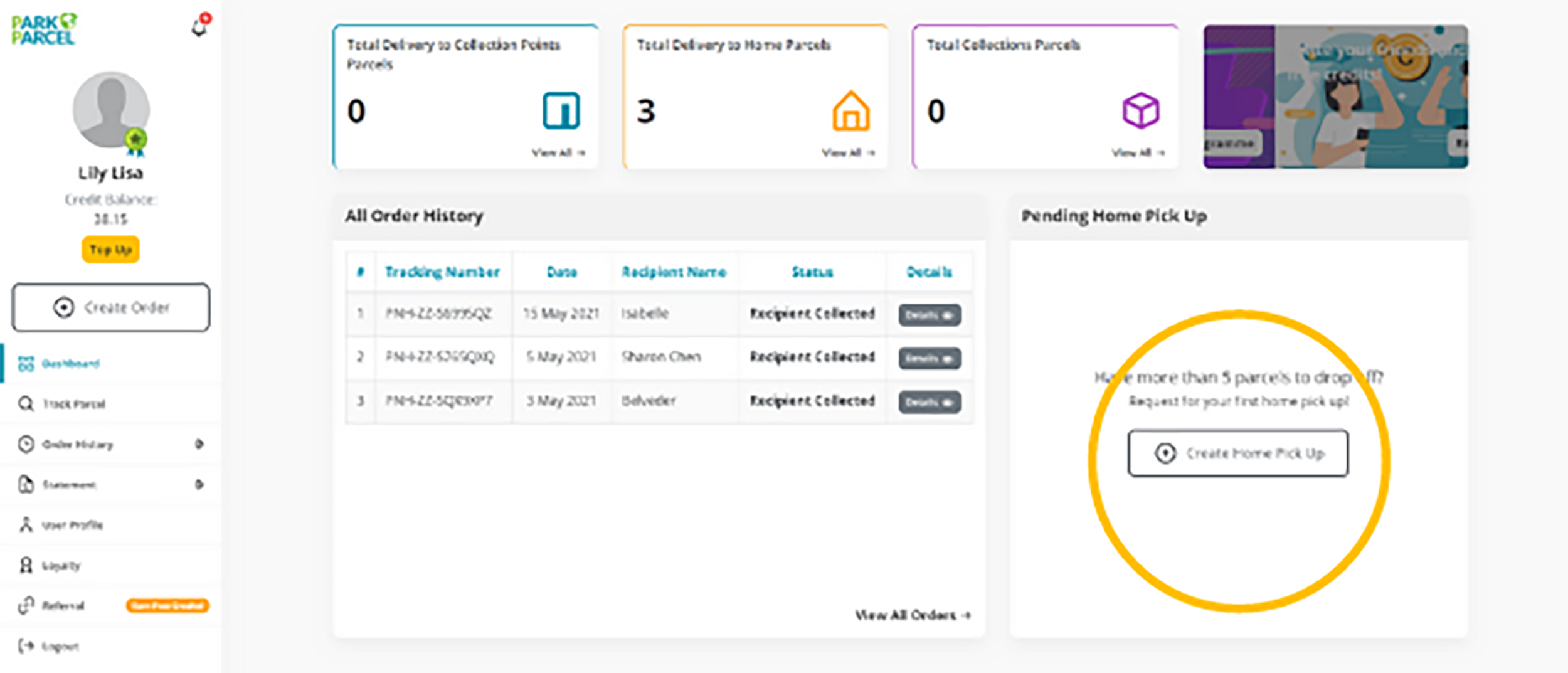 Do take note and ensure that you have fully completed creating the orders before proceeding to create home pickup (min. 5 parcels required). Otherwise, you may drop off at a parker point.