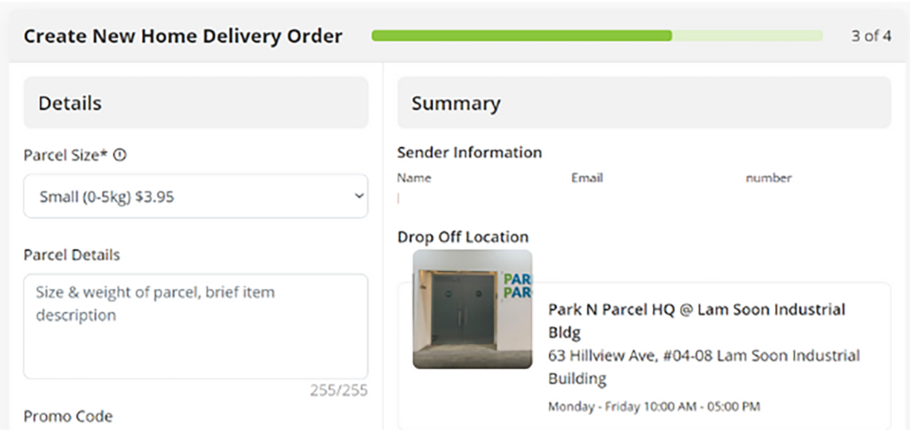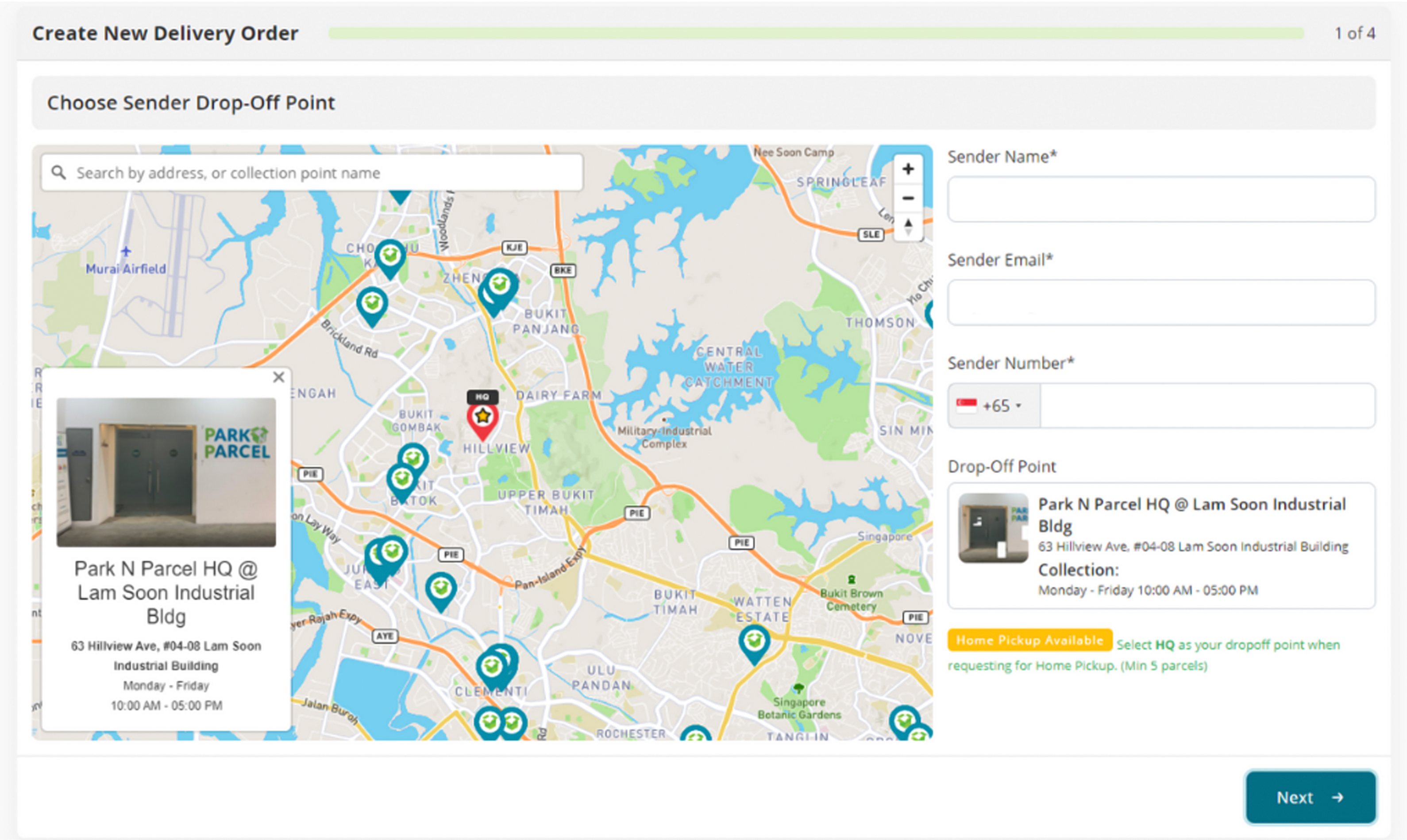 Select Park N Parcel HQ @ 1 Buroh Cres to create home pick-up later.