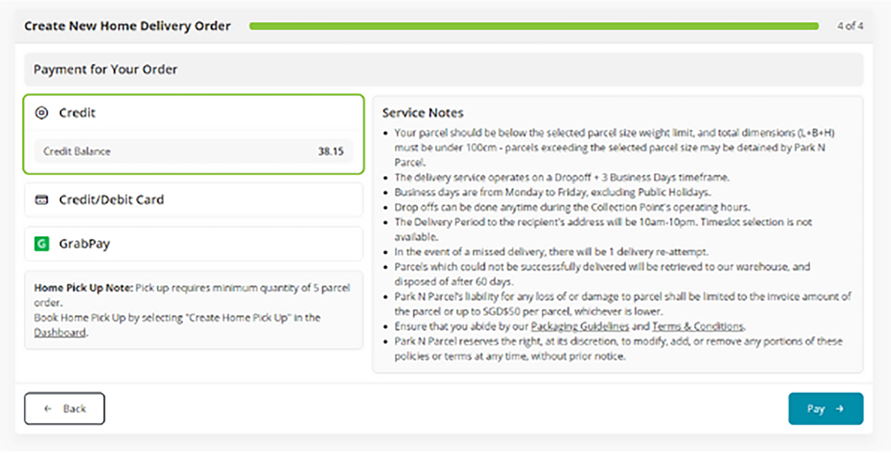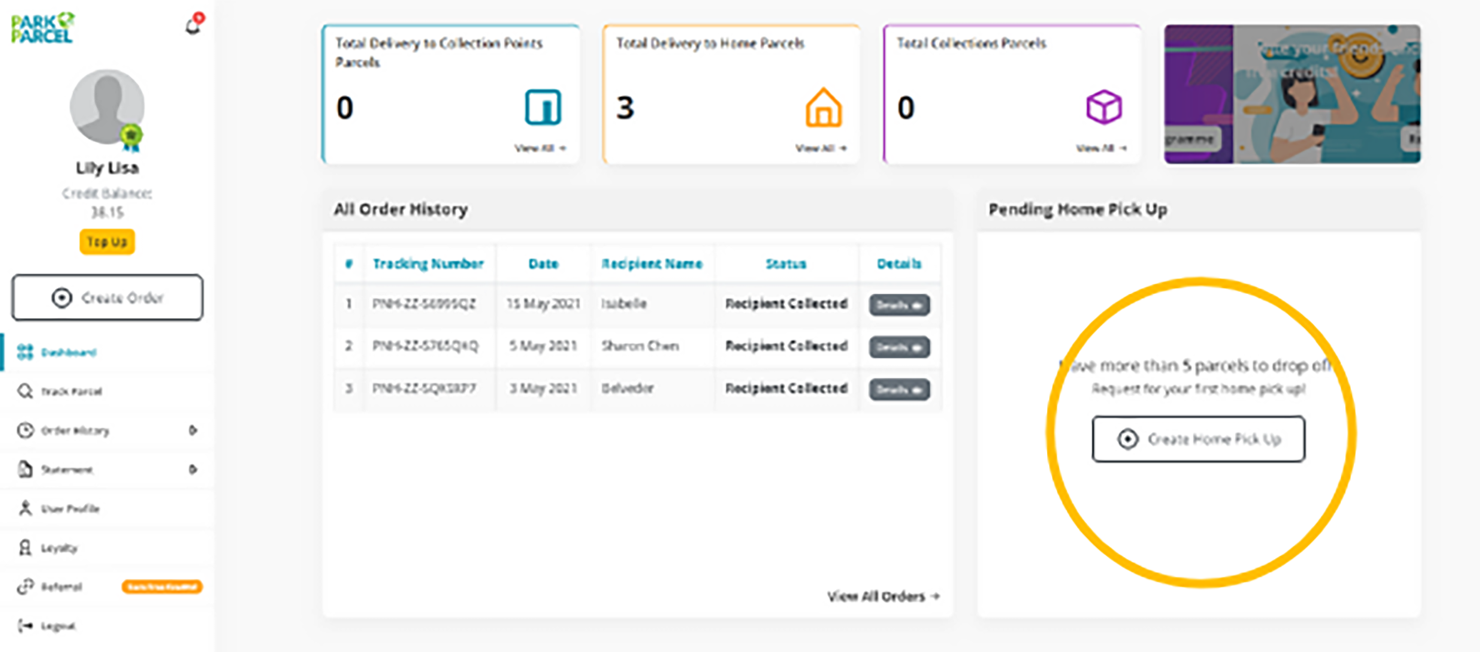 Do take note and ensure that you have fully completed creating the orders before proceeding to create home pickup (min. 5 parcels required). Otherwise, you may drop off at a parker point.